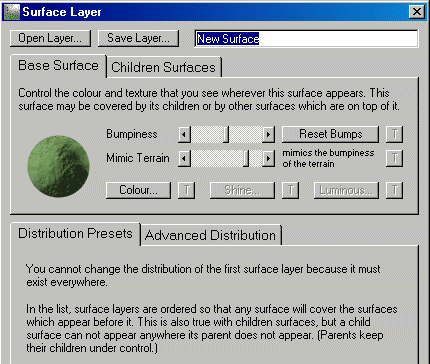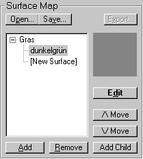 nennen. Man sollte unbedingt darauf achten, immer allen Layern, die man in der Surface Map verwendet, aussagekräftige Namen zu geben. Mit den beiden Buttons 'Open Layer' und 'Save Layer' kann man, wie die Namen schon sagen einen Layer (also den ausgewählten Teil der Surface Map) öffnen oder speichern. Man kann also z.B. einmal eine Einstellung für Gras vornehmen, und diese dann immer wieder verwenden, sich also später nur aus den von früheren Bildern vorhandenen Layern eine neue Surface Map zusammenstellen. Für unser Gras müssen wir jetzt noch die Farbe festlegen. Dazu klicken wir auf den Button 'Colour...' rechts neben der runden Vorschau. Es öffnet sich der Dialog zur Farbauswahl, in dem wir nun die vordefinierte Grün-Farbe wählen, indem wir auf das kleine grüne Kästchen über dem OK-Button klicken und dann die Einstellung mit OK übernehmen. Damit schließen wir die Einstellungen zur Grundlage ersteinmal ab, und schließen das Fenster. Da wir unser Gras aber nicht nur aus einer Farbe bestehen lassen wollen (Gras hat in der Realität ja auch unterschiedliche Farbausprägungen), erstellen wir zum eben erstellten Layer noch zwei 'Kinder', indem wir zweimal auf den Button 'Add Child' klicken. Auf unserer Liste mit den Layern sind nun zwei neue Einträge vorhanden. Wir wählen den ersten davon aus, und klicken wieder auf Edit. Dieses Kind soll nun den Namen Dunkelgrün bekommen, denn es wird den dunkelgrünen Teil des Grases darstellen. Es folgt wieder die Einstellung der Farbe, diesmal geben wir in dem Dialog die folgenden Werte ein: Red 4, Green 13, Blue 1. Den Dialog schließen wir durch einen Klick auf OK und sehen nun, daß die runde Vorschau dunkelgrün ist. Nun wollen wir noch einige weitere Einstellungen vornehmen, und öffnen dazu die zweite Registerkarte 'Advanced Distribution' im unteren Teil des Fensters. Links gibt es eine kleine Vorschau, die in der Größe dem Terrain entspricht. Wir sehen dort alle Stellen, an denen der Layer